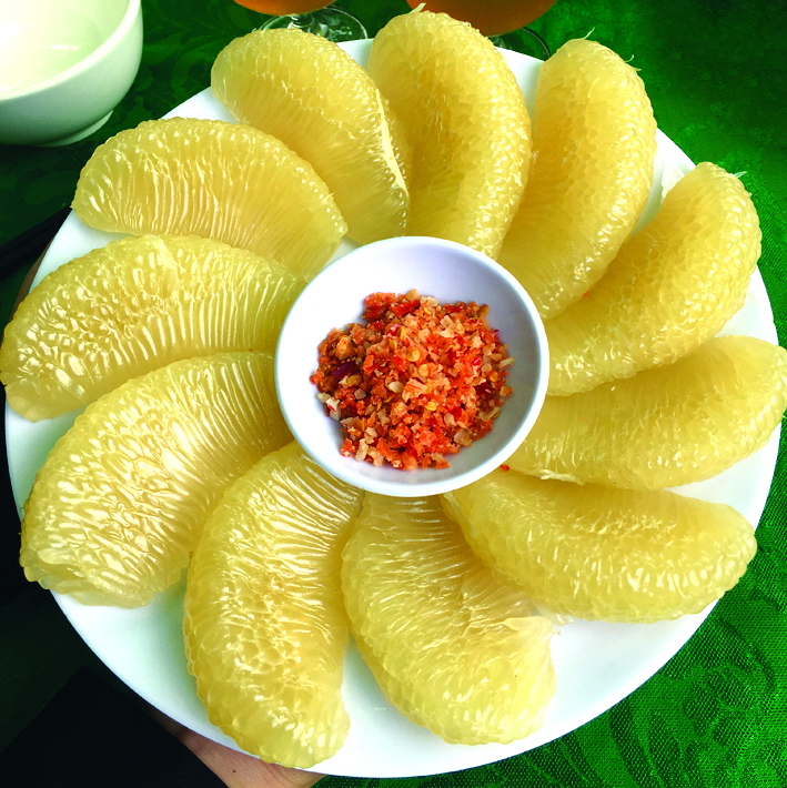 Không chỉ là trái cây tráng miệng, bưởi còn được dùng làm Gỏi bưởi trứ danh hay Rượu bưởi đậm đà để tiếp khách ngày xuân tại Làng bưởi Tân Triều.
